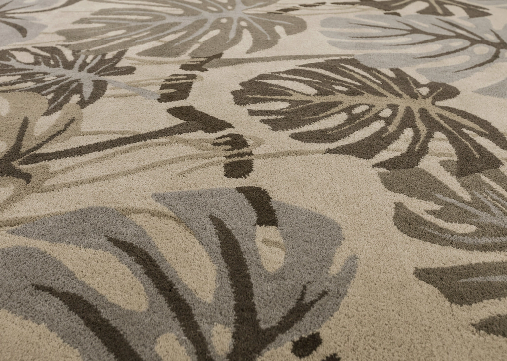 La alfombra Monstera deliciosa está confeccionada con hilados de pura lana, una fibra natural noble que asegura una pisada suave y confortable, que invita a ser vivida.