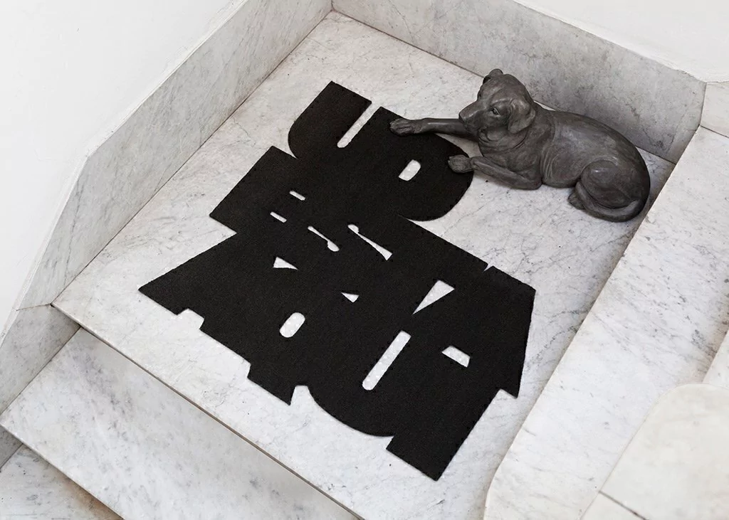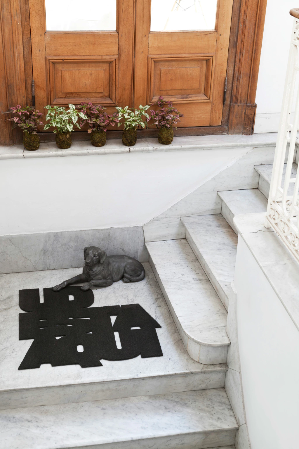"Usted está aquí" forma parte de la colección 2016 de felpudos del proyecto "Palabras", realizado por el Laboratorio de Diseño y Sustentabilidad de El Espartano junto a Galpón Estudio. Este desarrollo busca desafiar al concepto tradicional de los felpudos a través de frases caladas en alfombras que representan formas lúdicas y más alegres del trato cotidiano con los demás. A los anteriores motivos, se suman ahora Ciao, Hola, Pase, Llaves, Ud está aquí y Casa.