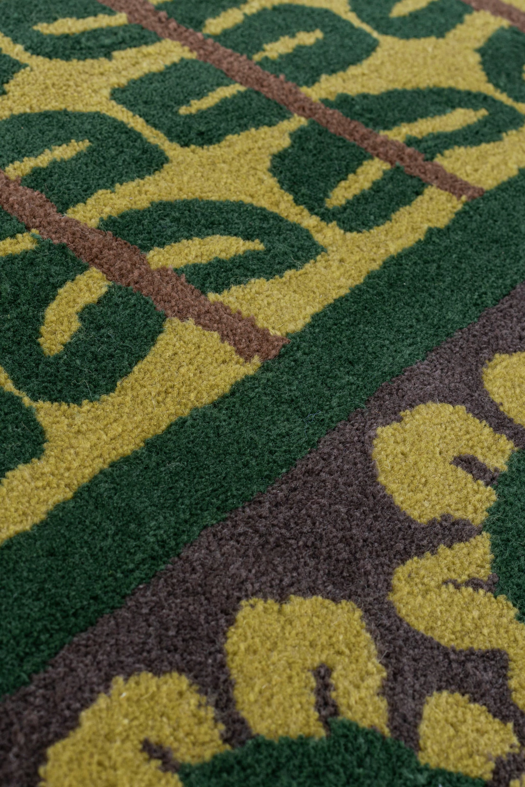 Está tejida con el sistema tufting en 100% lana de pelo cortado, con límites irregulares y un acabado artesanal preservando el estilo orgánico, el trazo libre y la espontaneidad del artista en el proceso creativo.